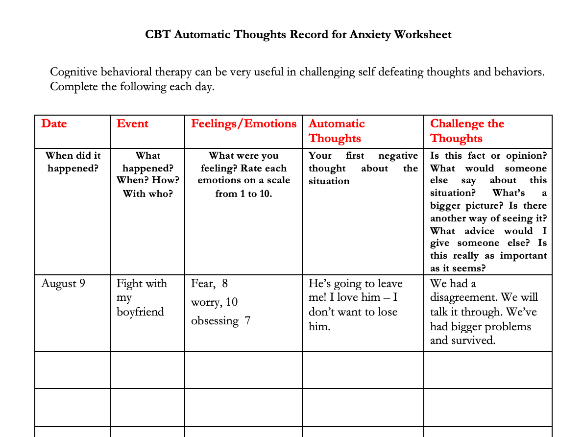 Selfdefeating Thoughts Worksheet - Negative Automatic Thoughts Ants Great Examples And 3 Useful Worksheets For You Cbt :. Self defeating beliefs questionnaire cbt worksheets, therapy worksheets, thinking errors, cognitive distortions,. Try the workbook in your own cbt practice! For some people, jumping to conclusions involves consciously or unconsciously avoiding evidence that contradicts your assumptions. Here's a list of 25 cognitive behavioral therapy techniques, cbt interventions, exercises and tools. Then for the third column on the worksheet, you want to record the thoughts or images that went through your mind just before you had the .